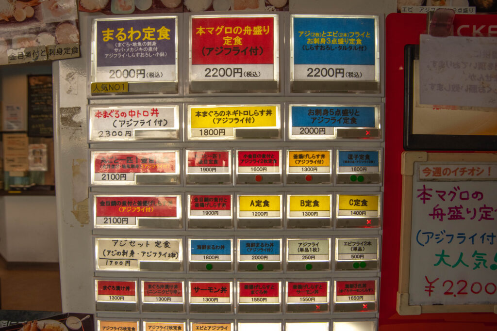 In addition to the “Maruwa Teishoku,” there’s the Hon-Maguro Boat Platter Set (with fried aji, ¥2,200), and another set that includes aji & shrimp fries plus a trio of sashimi (¥2,200). All sets are generously portioned and made with super fresh seafood. You get to enjoy fried, simmered, and raw fish all in one meal—what a treat! If you visit slightly before or after peak lunch hours, you’ll likely be seated quickly even on weekends.