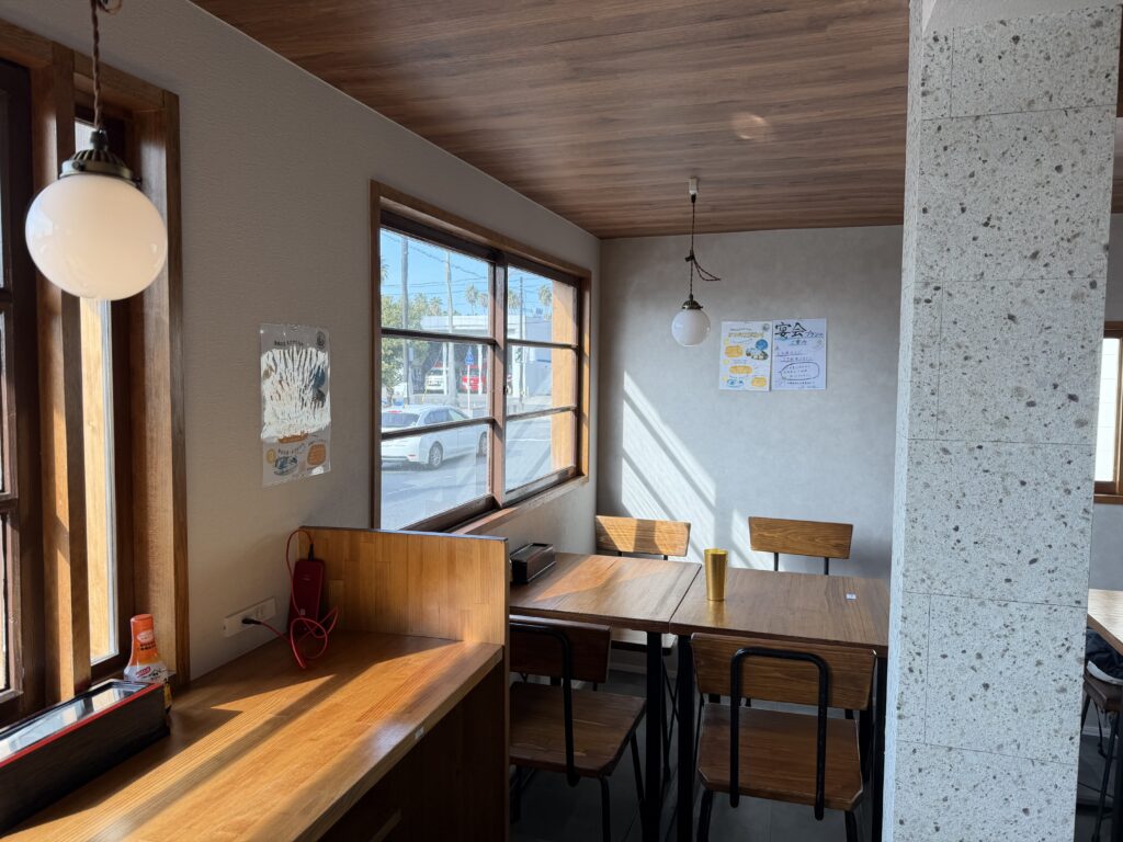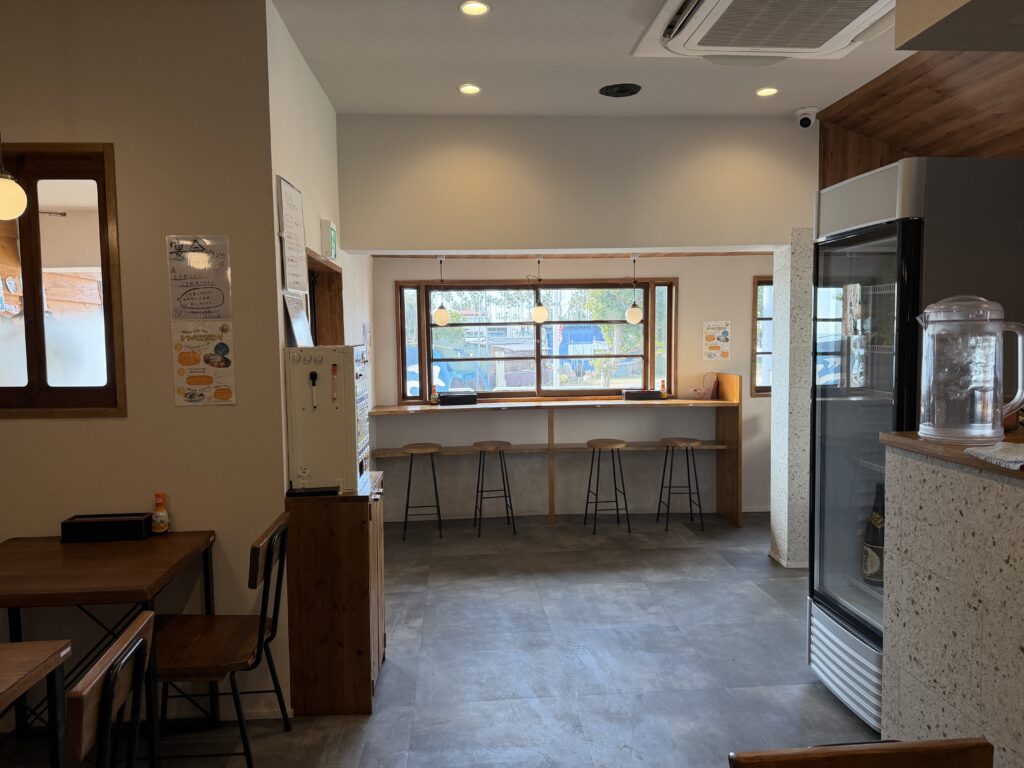 The restaurant has a compact layout with counter seats and a few tables.