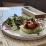Fresh tuna and salmon are paired with avocado, creating a vibrant and colorful dish.