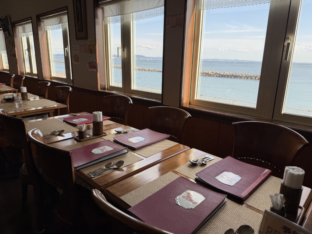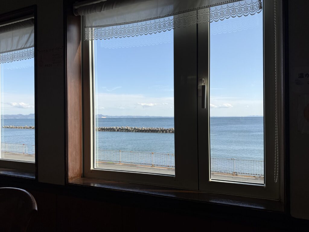 Beyond the windows stretches the quiet Nobi coastline.